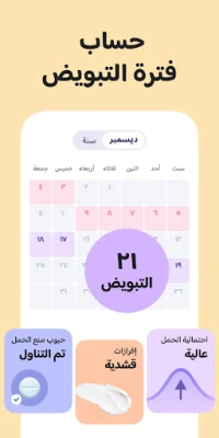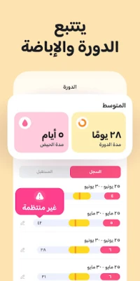 اكتشفي رفيقتكِ المثالية لرحلة صحة المرأة الشاملة! سواء كانت دورتك الشهرية منتظمة كالساعة أو تحتاجين لتوقعات أكثر دقة، يقدم لكِ هذا التطبيق رؤى لا مثيل لها حول دورتك، نافذة الخصوبة، وأيام الإباضة المحتملة يومًا بيوم. إنه ليس مجرد متتبع، بل هو دفتر يومياتك الصحية المتكامل الذي يمكّنكِ من تسجيل ومتابعة كل التفاصيل الهامة: من مخاط عنق الرحم ودرجة الحرارة الأساسية، إلى النشاط البدني، الوزن، مؤشر كتلة الجسم، وحتى تقلباتك المزاجية وأي أعراض تشعرين بها. افهمي جسدك بشكل أعمق، وخططي لصحة أفضل وحياة متوازنة.